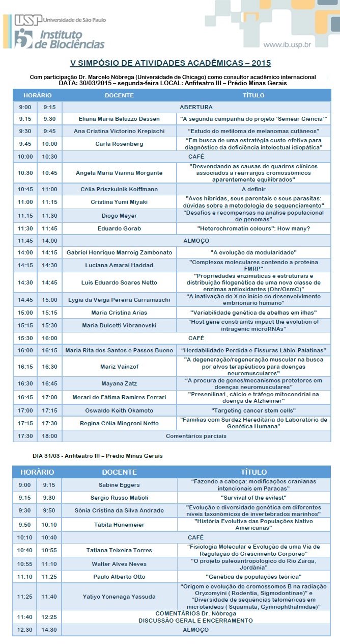 Local: Sala Therezinha Ungaretti do Departamento de Genética e Biologia Evolutiva.