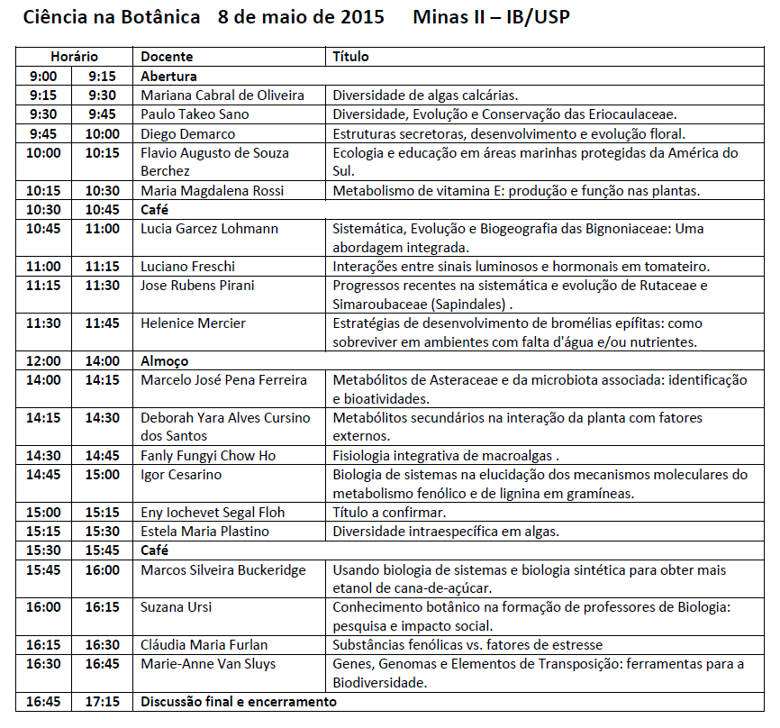 Título:Ciência na BotânicaData: 08.05.15Hora:09h-17h15Local:Minas II - IB/USP