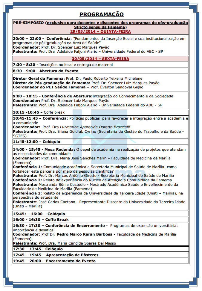 A Faculdade de Medicina de Marília (FAMEMA) promove o IV Simpósio de Pós-Graduação e Mostra PET-Saúde. O evento conta com palestras e conferências sobre interação entre academia e comunidade, bem como estratégias e metodologias para parcerias e projetos que integrem o conhecimento acadêmico à vida das pessoas.