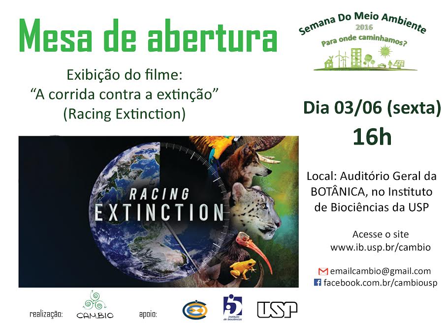 Amanhã teremos a mesa de abertura, com exibição do filme "Racing Extinction", que ocorrerá as 16h, no AG da Botânica.