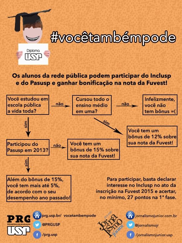 Os candidatos da rede pública de ensino podem participar do INCLUSP e do PASUSP e ganhar bonificação na pontuação da Fuvest. Para participar do INCLUSP, basta informar, no momento de sua inscrição no vestibular da FUVEST que você é aluno da escola pública e deseja participar do Sistema de Pontuação Acrescida.
