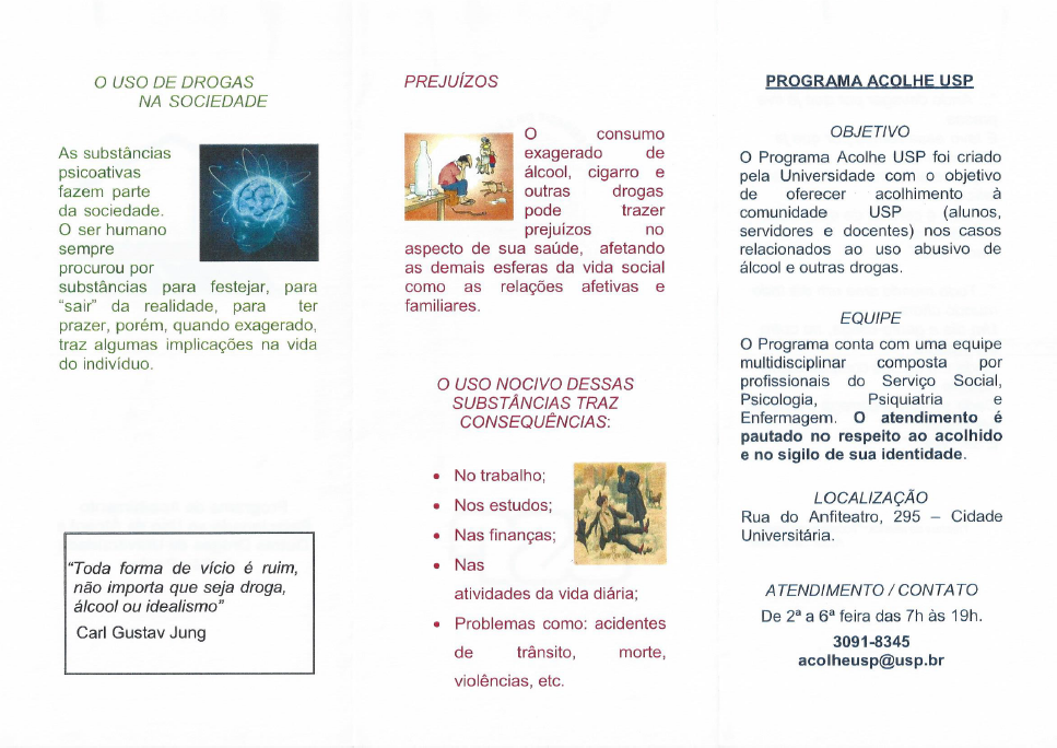 O Programa Acolhe USP foi criado pela Universidade de São Paulo com o objetivo de oferecer acolhimento à comunidade USP (alunos, servidores e docentes) nos casos relacionados ao uso abusivo de álcool e outras drogas.