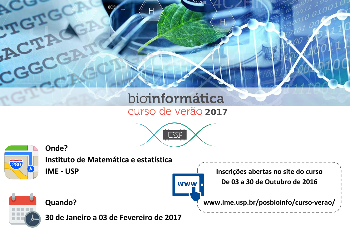 Os Pós-Graduandos e a Comissão de Pós-Graduação Interunidades em Bioinformática da Universidade de São Paulo têm o prazer de anunciar o VIII Curso de Verão em Bioinformática. Todo ano, o curso é organizado pelos Professores e pós-graduandos do programa e conta com o apoio da Associação Brasileira de Bioinformática e Biologia Computacional (AB3C) e de grandes nomes da bioinformática brasileira e mundial como palestrantes, propiciando informações aos interessados e futuros ingressantes na área de bioinformática.