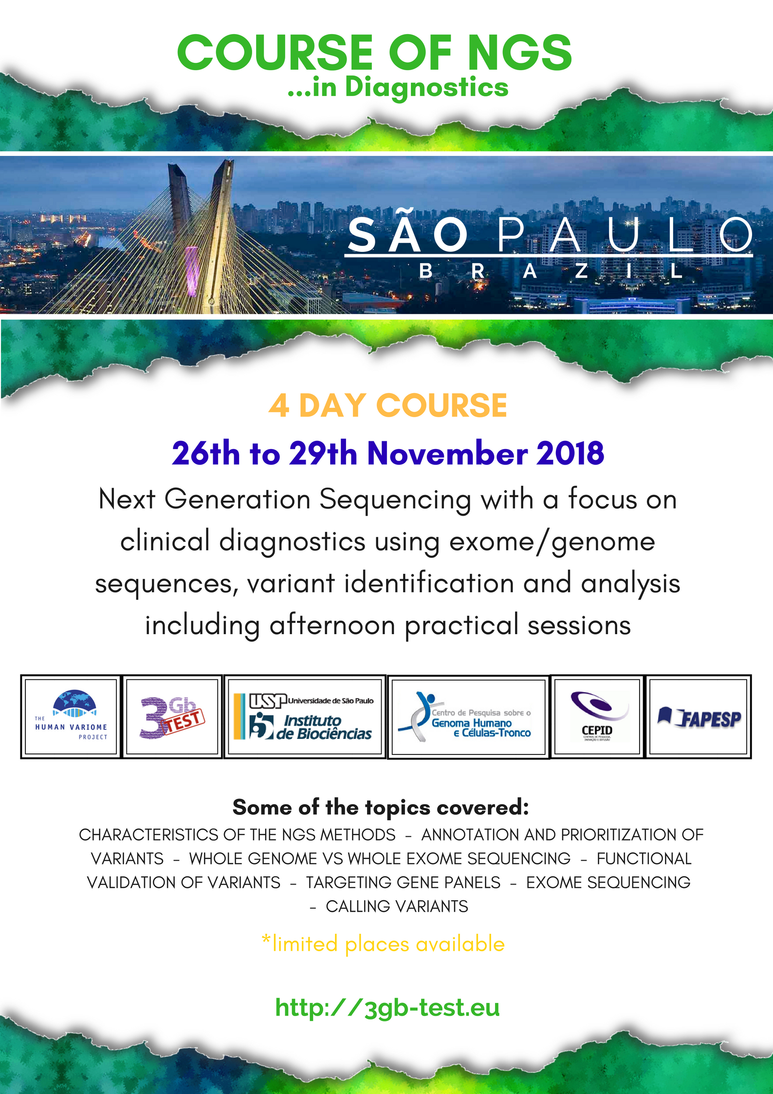 "O Centro de Pesquisa sobre o Genoma Humano e Células-Tronco (CEGH-CEL) do Instituto de Biociências, Universidade de São Paulo em conjunto com a Universidade de Leiden, Holanda, tem o prazer de convidar a comunidade científica para participar do curso internacional NGS in Diagnostics a ser realizado em São Paulo (CEGH-CEL, IBUSP) entre os dias 26 a 29 de Novembro, 2018.