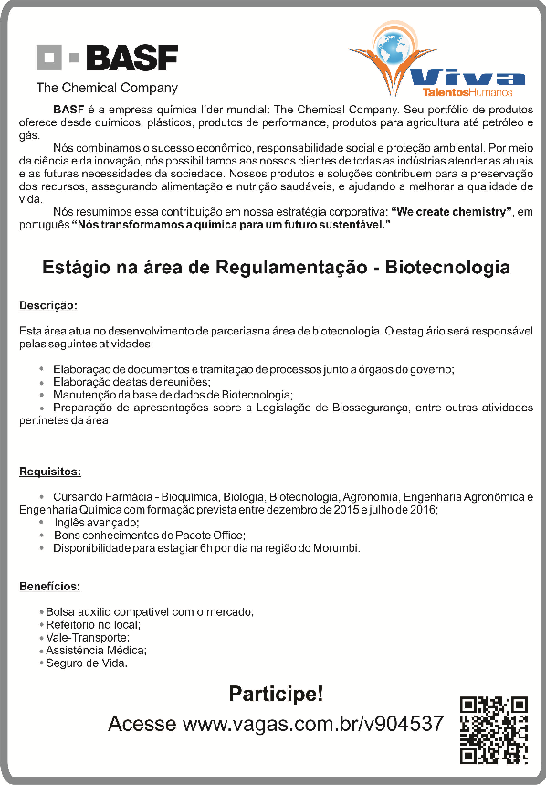 A BASF, líder no setor químico, procura estagiários na área de Regulamentação em Biotecnologia. A empresa procura graduandos em Biologia e áreas afins que tenham previsão de graduação entre dezembro de 2015 e julho de 2016.